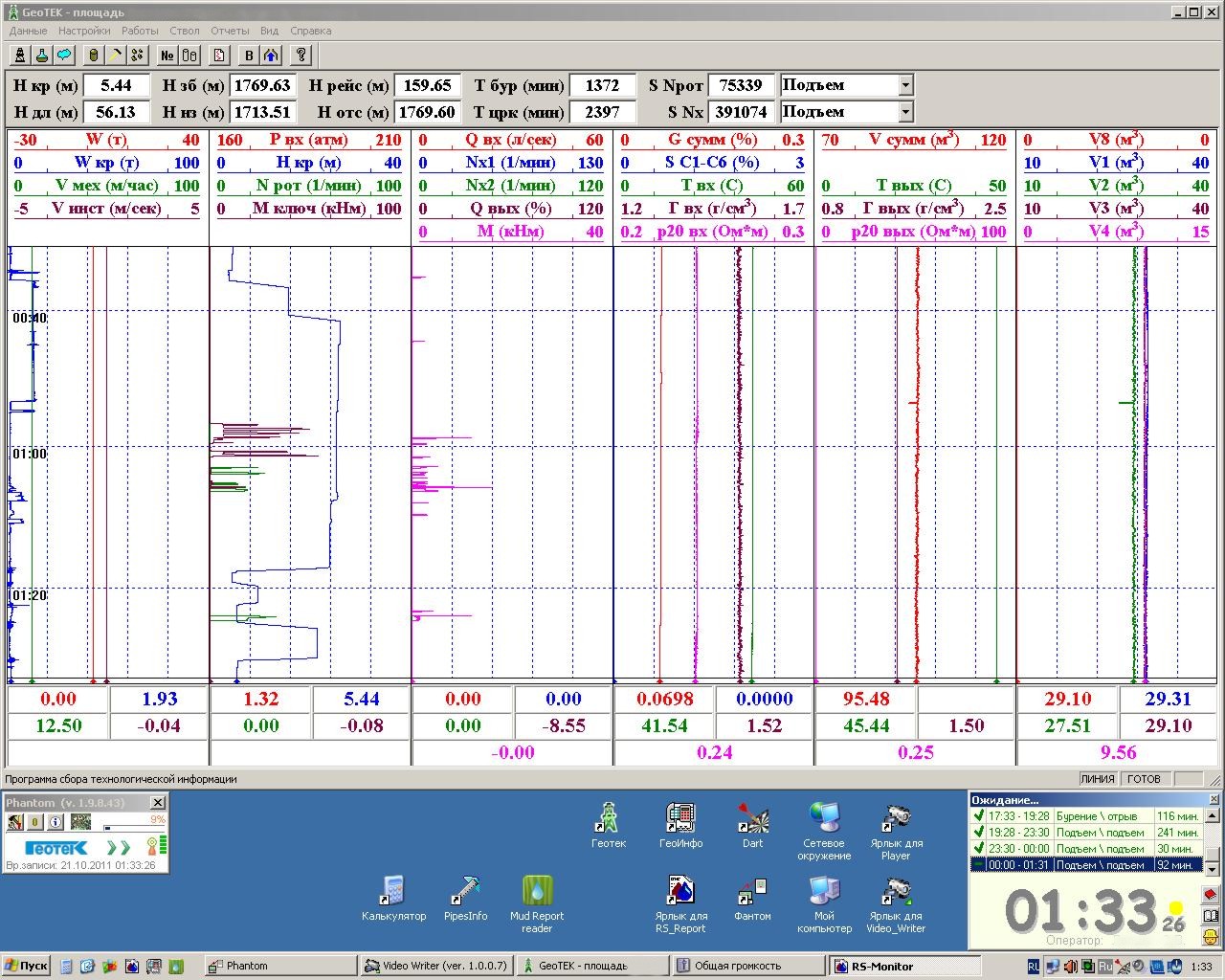 - Программа GEOTEK, осуществляющая прием, запись в базу данных и отображение в режиме реального времени всего объема технологической, геологической, газометрической и инклинометрической информации, ее визуализацию и анализ в режиме реального времени для решения оперативных задач информационного обеспечения процесса строительства скважины.